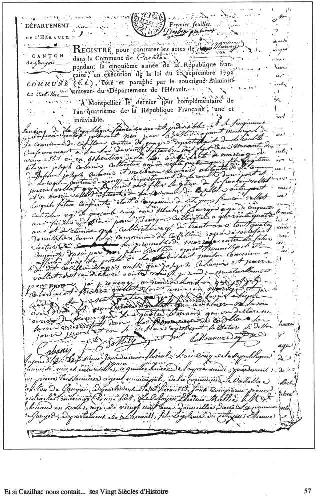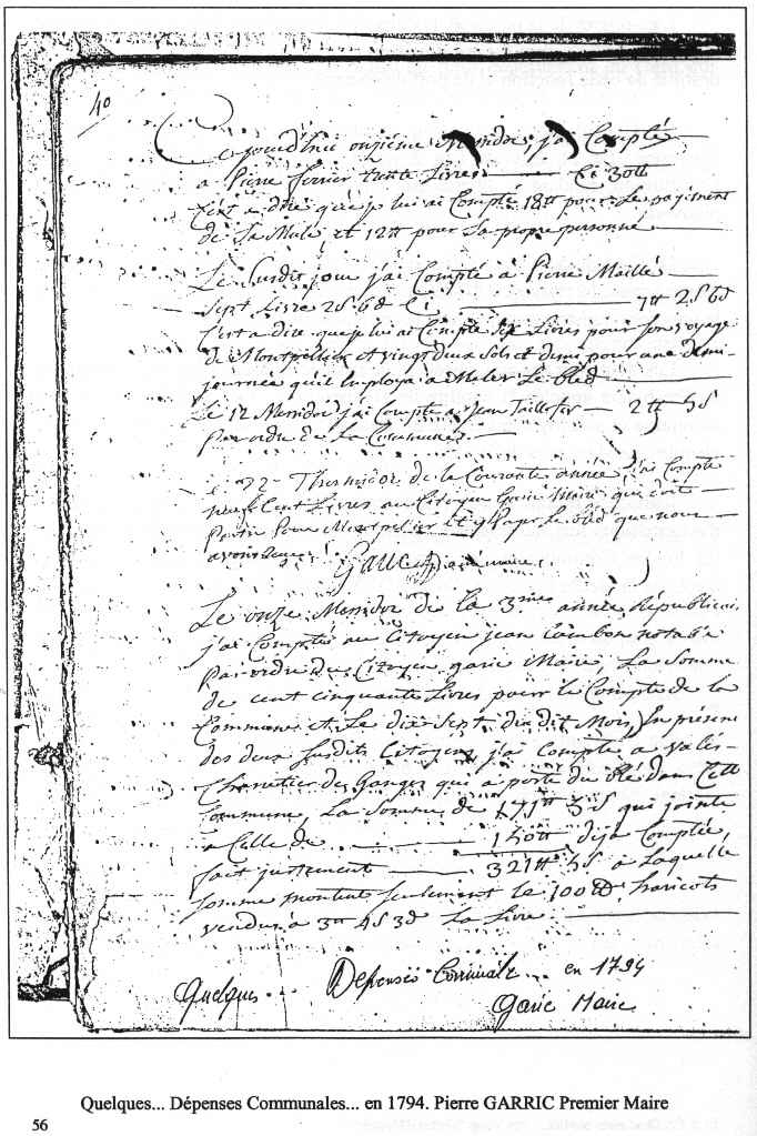 En 1792 cesse d'exister la Province du Languedoc qui est divisée en 8 départements. Nous n'avons pas encore de Maire "Officiel", c'est toujours le Consul de la commune, Pierre GARRIC, qui est chargé de cette fonction et de gérer la Maison Commune (Mairie).