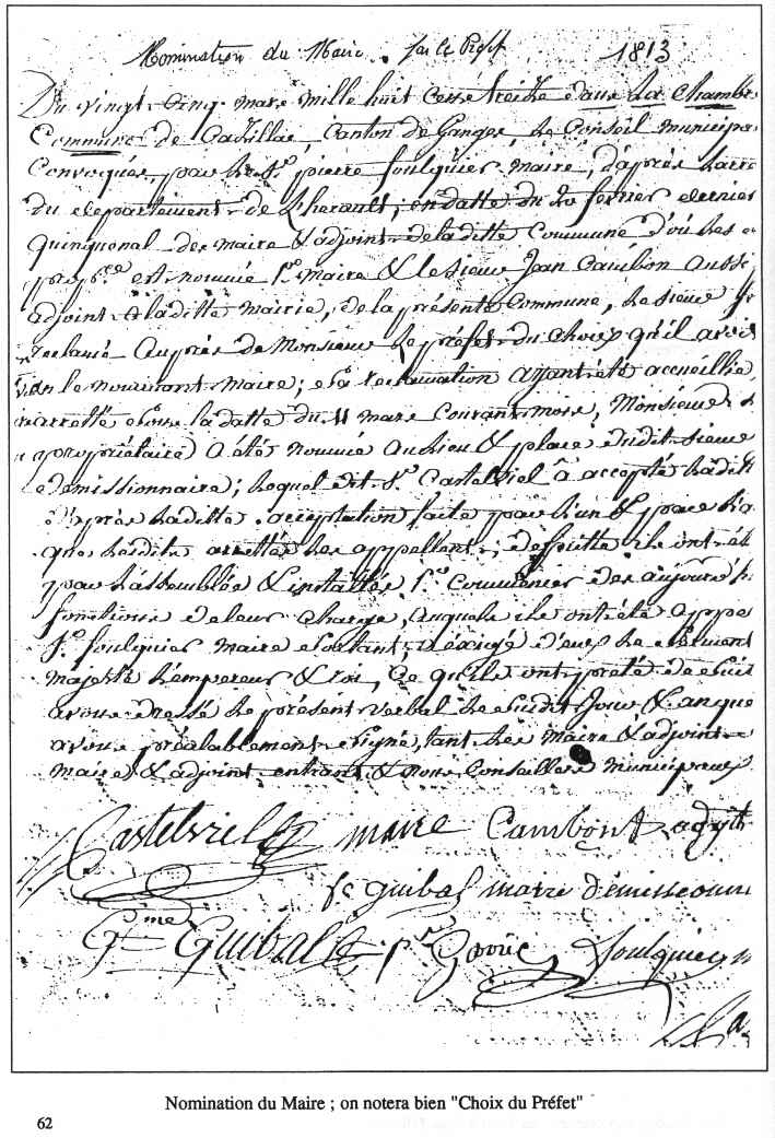 1800, nous savons que le premier Consul Napoléon nomme les Préfets sur liste de Notables et que les Préfets à leur tour nomment les Maires et désignent les Conseillers Municipaux toujours parmi les notables du village. C'est ainsi que nous trouvons, en 1800 avec la réapparition des archives, la nomination de Jean RIBARD en qualité de deuxième Maire de Cazilhac et de ses neuf Conseillers Municipaux dont un adjoint Pierre FOULQUIER (futur maire), Michel CAMBON, Louis CASTELVIEL (et non De Castelviel), Jacques RIBARD, Pierre DURAND, François GOUNELLE, Guillaume GUIBAL (fils de François Guibal), Pierre GROS et François GUIBAL (père).