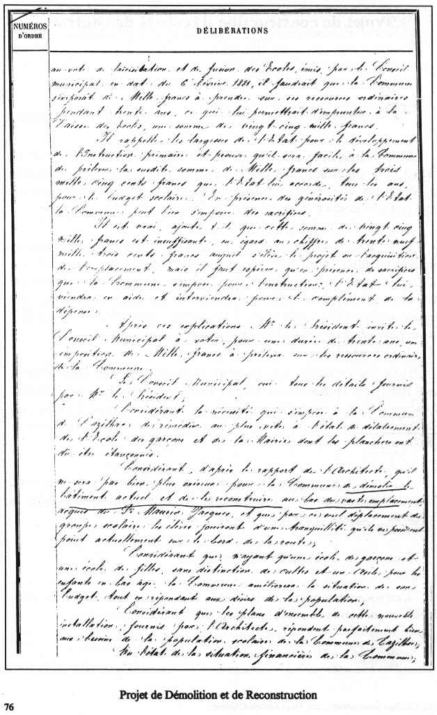 Son Conseil le suit et le rejoint dans cette laïcisation et fusion d'écoles, sans distinction de culte, le rejoint également dans son projet de nouvelle construction, "Mairie-Ecole-Asile", et donne son accord pour une subvention de 100 francs au Pasteur et 100 francs au Curé pour l'enseignement religieux en dehors des heures de cours.
