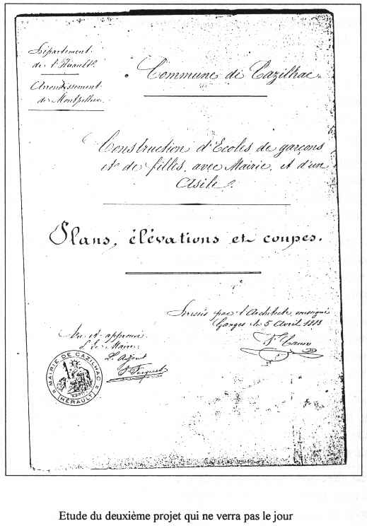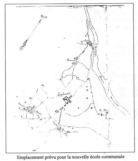 Deux ans s'écoulent. Une première étude est faite. Des plans et devis sont établis par l'Agent Voyer, le prix s'élève à 14 868 francs. Le Conseil approuve à'l'unanimité. Le Préfet donne son accord, on achète le terrain à la Baraquette au Sieur Ribard (actuelle Mairie), en Mars 1857 pour la somme de 10 000 francs. Les fonds ? On pense se les procurer en vendant une coupe de bois 5 000 francs, en empruntant 3000 francs auprès de la Caisse des Ecoles, plus en faisant un deuxième emprunt payable en 10 ans.