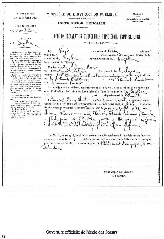 privée St-Joseph avec Soeur Rosalie SOLIGNAC, autorisation d'ouverture