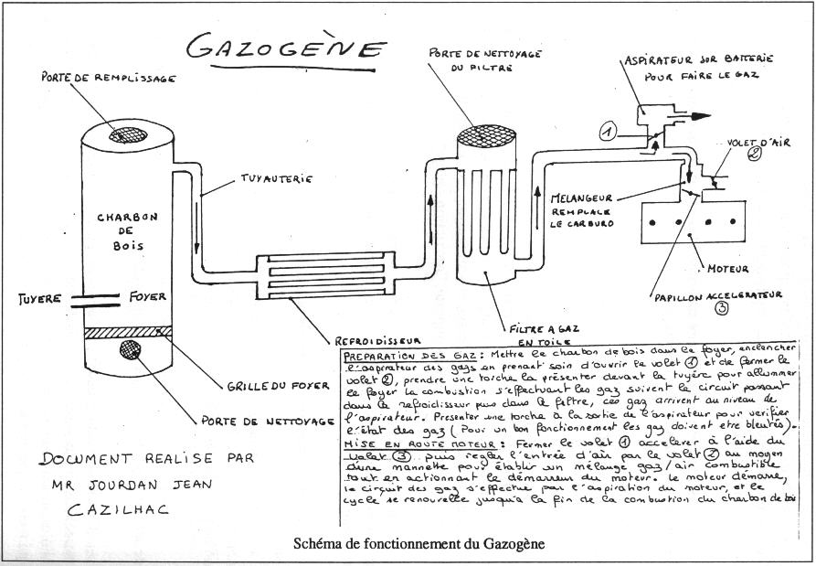 Pratiquement tous les véhicules automobiles, voitures, camionnettes étaient équipés de "gazogène". C'était une espèce de marmite géante placée sur le côté ou à l'arrière du véhicule, alimentée par du bois ou du charbon de bois, qui par un système de filtrage fournissait un gaz substitutif à l'essence mais en qualité inférieure. Peu importe, "restriction oblige".