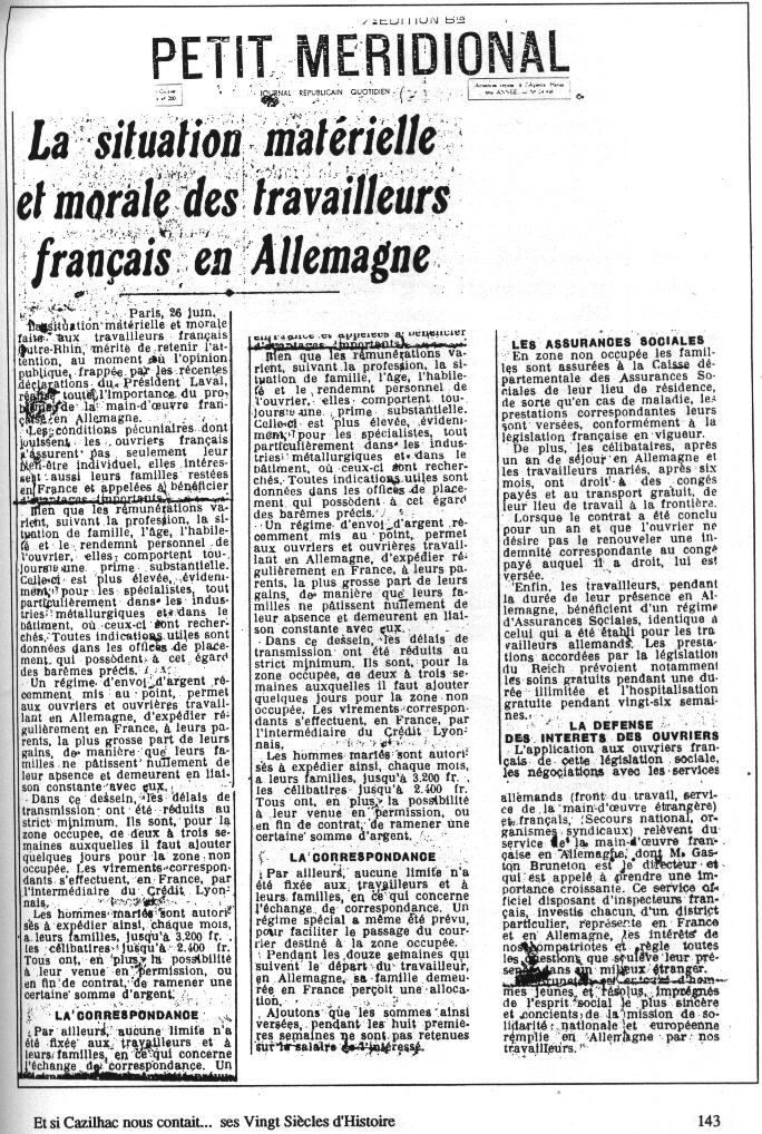 En 1942, l'occupant décrète l'institution de la relève, c'est-à-dire : pour trois ouvriers français partant volontairement travailler en Allemagne, un prisonnier français retournera dans son foyer. Un ou deux exemples à Cazilhac. C'est l'expatriation des jeunes S.T.O. Service Travail Obligatoire en Allemagne dont deux ne reviendront pas : Emile FOULQUIER, Jacques FAVEL mort au camp de Kommando Zwieberge de Buchenwald.