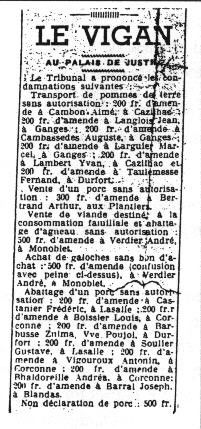 Par contre, les condamnations "pleuvent" pour les petits "délinquants" à consommation familiale. C'est ainsi que sont condamnés par le tribunal du Vigan trois habitants de Cazilhac, pour le délit suivant : 50 kilos de pommes de terre pour l'un, un agneau et un cochon achetés sans autorisation, 200 Francs d'amende pour chacun d'eux et confiscation du produit évidemment. Ce même tribunal (compte-rendu du journal "Le petit Méridional" du 27 juin 1942) nous informe sur d'autres condamnations prononcées chez nos voisins. Est condamné un habitant pour l'achat de plusieurs paires de galoches (sans bon d'achat légal) à 500 francs d'amende et à la même somme pour non-déclaration d'élevage de cochon... seul le gibier et la volaille étaient dispensés de déclaration, en petit nombre bien sûr. Ce rationnement forcé, avec son marché parallèle, va s'atténuer progressivement après la libération pour se terminer définitivement en 1946.