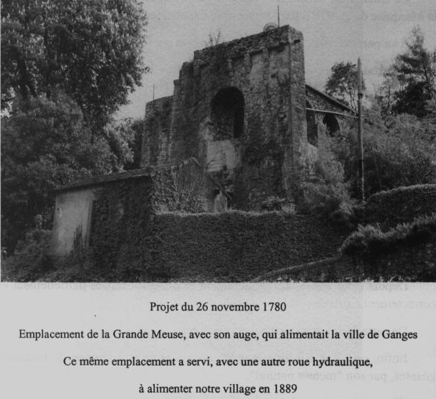 La première, appelée "La Grande Meuse" par ses treize mètres de diamètre, alimentait les sept fontaines de la ville de Ganges et le Château de la Marquise (projet du 26 novembre 1780). De cette oeuvre gigantesque, il ne reste plus que le support curieusement marqué en tête de mâchicoulis d'où tournait cette impressionnante machine hydraulique. La deuxième (disparue aussi) fut implantée en 1836 à quelques dizaines de mètres, elle irriguait des terres privées.