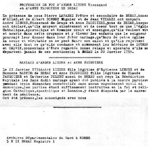 21 janvier 1739, registre de Bréau : le mariage est précédé d'une profession de foi catholique. Il est donc certain que ce mariage de 1739 n'est qu'une régularisation officielle et qu'un mariage protestant a eut lieu auparavant.