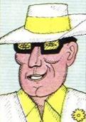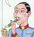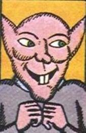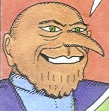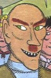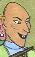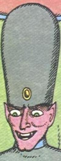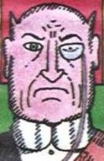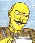 Le Grand méchant récurant de la série, doté d’une tête en forme de pastèque allongée, dents de vampire et oreilles pointues, il ne semble pas humain mais curieusement cela ne dérange pas beaucoup ceux qui le voient. Dans l’ile de la Momie c’est un Méchant à la James Bond utilisant une débauche de moyen technologiques pour récupérer un trésor pourtant modeste. Dans le Taureau de Conkhobar, il devient mercenaire terroriste pour renflouer ses caisses, dans du jus d’orange pour Cramélas, il cherche seulement à truquer les élections du petit pays de Balical, et tremble devant La Buse, il n’est plus que l’ombre de lui-même ; il promet de revenir se venger, mais ne reviendra pas ! | |||||