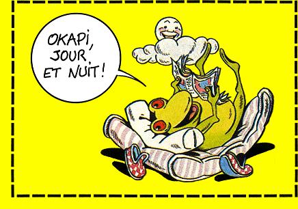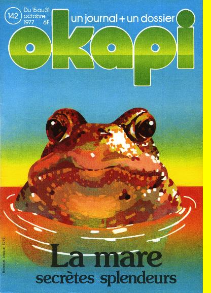 C'est sur cette page qu'elles se sont particulièrement illustrées, se livrant à toutes les transformations imaginables pour incarner le sujet de chaque dossier… un tantinet exhibitionnistes – on peut observer que les grenouilles de Nicole Claveloux ont un nombril – elles ne montrent pourtant pas tout : ainsi n'ont-elles pas voulu dévoiler « les secrets d'une mare » (n° 327il est vrai qu'elles en avaient déjà montré les « secrètes splendeurs » huit ans plus tôt, sur la couverture reproduite ci-dessus (n° 142).), et ont préféré disparaître avant d'illustrer un dossier sur la météo (n° 422), sans parler des Univers-posters qu'elles ont évités avec constance – mais on les retrouve pour quelques incitations à l'abonnement, en forme de bandes dessinées. Un « frog show » de près de soixante-dix figuresil en manque peut-être : il est en effet assez difficile de reconstituer une collection d'Okapi complète avec les Univers, alors que ceux-ci ont souvent été détachés du journal et que c'est justement là que se logent les grenouilles ! Avis de recherche donc pour les vieux Okapiens internautes, contributeurs aux yeux exercés qui pourraient nous signaler l'existence de spécimens non repérés…, que vous pouvez enfin retrouver sur ce site !