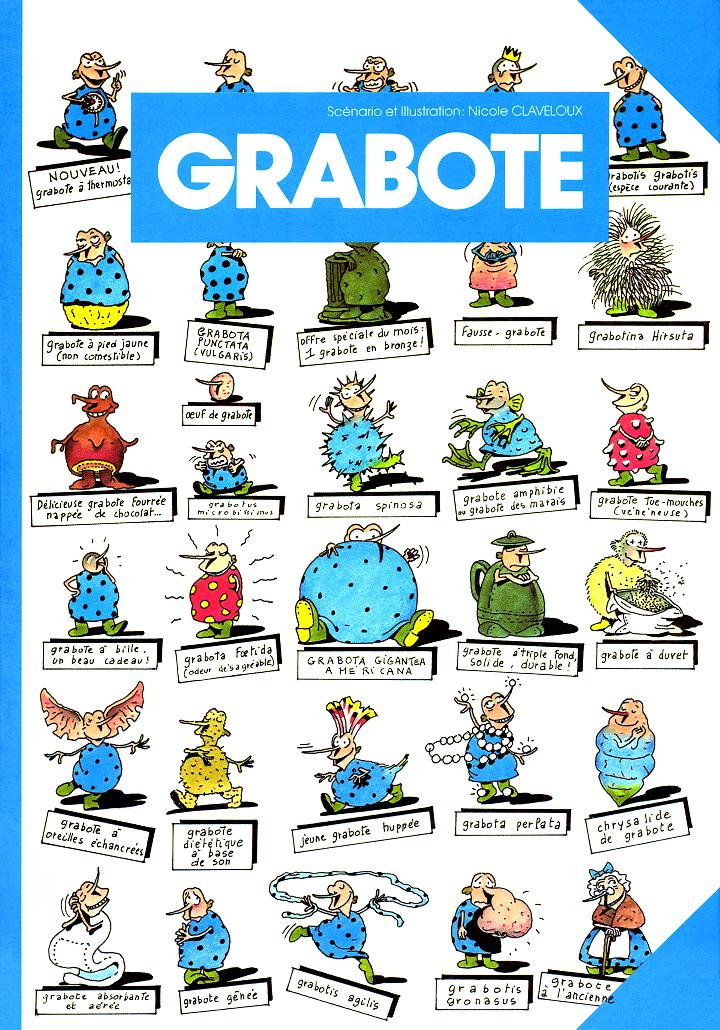 Dans la volumineuse bibliographie de Nicole Claveloux, Grabote occupe une place à sa mesure, qui est réduite comme vous le savez (0,22 m), mais pourtant bien à elle, car les livres non seulement illustrés mais également écrits par NC ne sont pas si nombreuxla liste n'est pas très longue : outre les 5 albums de Grabote, il y a La Ballade des bigorneaux (1979 / 1994), Le Petit Légume qui rêvait d'être une panthère (1980), Louise XIV (1985), 479 espèces de poux (1985), Quel genre de bisous ? (1990), et Professeur Totem et Docteur Tabou (2006)... alors que Nicole Claveloux a illustré plus de 150 livres !