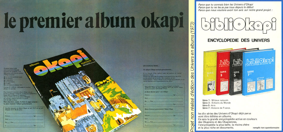 La publication d'albums n'a jamais été une priorité de Bayard Presse, et la bibliographie qui suit n’est donc pas très fournie. Le succès du groupe repose sur un public d'abonnés à ses titres de presse : ainsi la création d'Okapi répondait à une demande des lecteurs de La Croix d'obtenir un journal de qualité pour leurs enfants et au début les exemplaires d’Okapi qui n’étaient pas destinés aux abonnés étaient mal distribués en kiosque, le réseau de diffusion passant plutôt par les lieux d'enseignement religieux. Comme souvent pour les périodiques, les numéros non vendus ont tout d'abord été reliés en albums : il y en a eu une dizaine à partir de décembre 1972 et jusqu'en 1974, qui rassemblent 6 numéros par volume.
