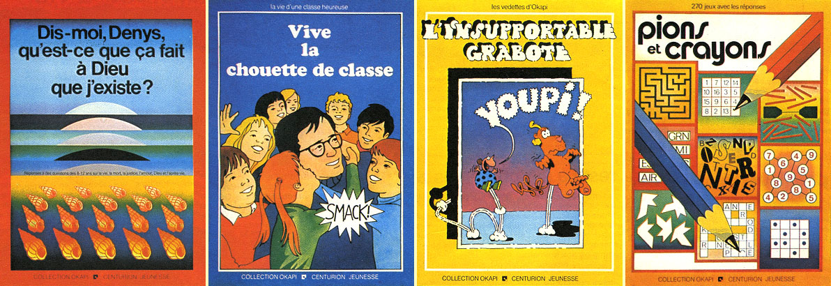 Quatre nouveaux titres suivent en mai 1975 : un recueil des jeux de France de Ranchin réunis sous le titre Pions et Crayons ainsi qu'une anthologie des textes de la rubrique Dis-moi Denys (Qu'est-ce que ça fait à Dieu que j'existe?). L'Insupportable Grabote a droit à son album dans la collection, même si la toute première planche manque au recueil ainsi que la 33e (une « édition spéciale » qui faisait allusion à un fait réel : des catholiques intégristes avaient bel et bien brûlé des numéros d'Okapi en 1974...) Vive la chouette de classe est une sélection de 18 parmi les premières histoires de la série, parfois reformatées pour la publication. Un deuxième tome était annoncé : Ça bouge dans la Chouette de classe, mais il ne verra jamais le jour – pas plus que Les Sept Tombeaux d'Amiraseth ou la suite des aventures de Grabote à bord du Capsulotron... en effet les livres de la collection Okapi se vendent plutôt mal et certains sont pilonnés (pourtant Mon corps vivant sera réédité en 1979 et Dis-moi Denys deviendra une collection à part entière).